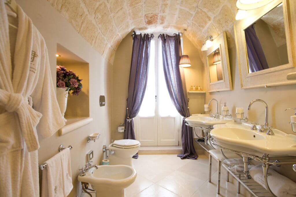 - Wände: Glatte Kalkputze, helle Fliesen oder Teilbereiche mit Mosaik.