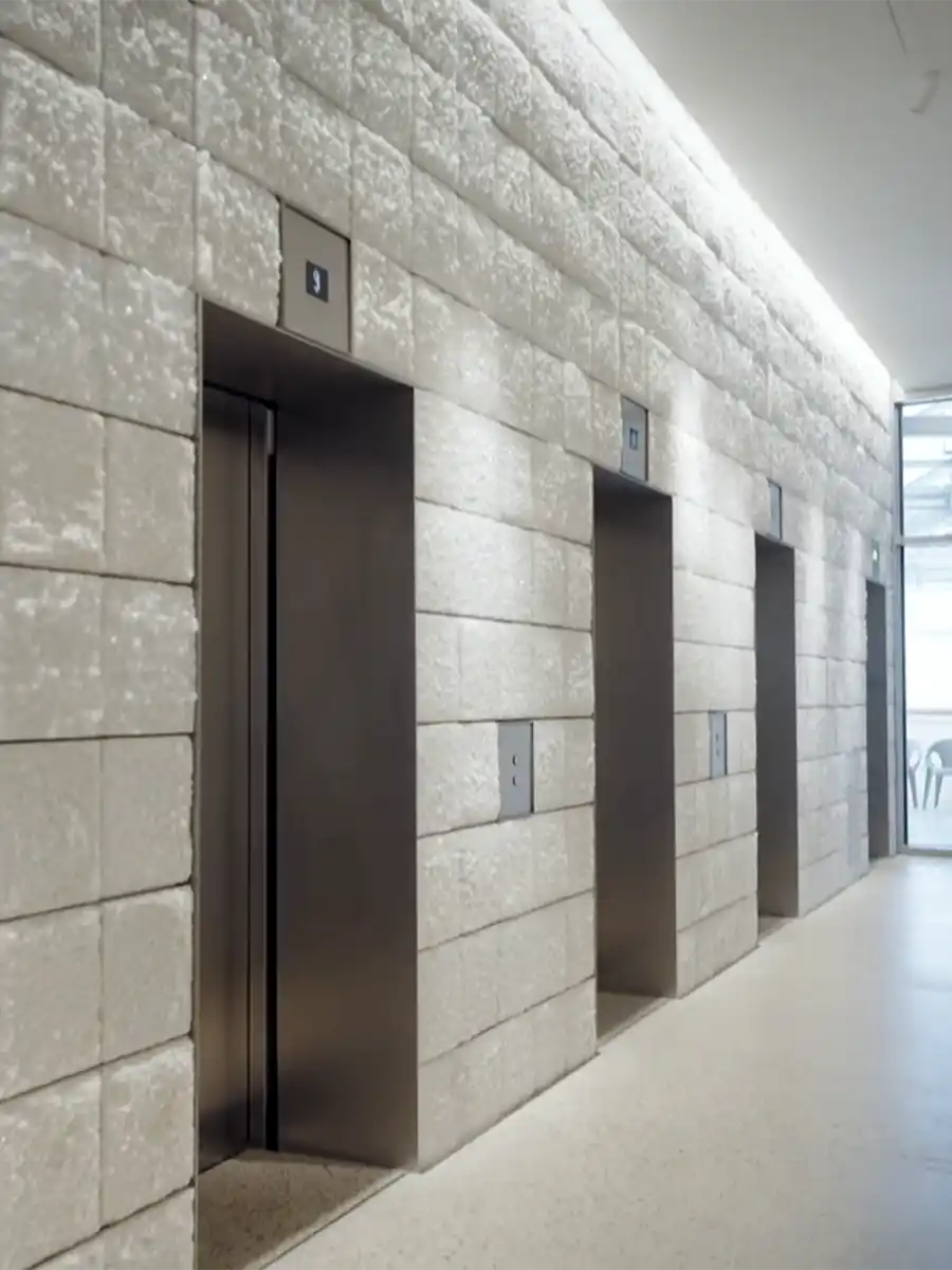Die Innenverkleidung im Turm wurde aus einer Mischung aus Sonnenblumenstängeln und Lehm hergestellt, die im Atelier LUMA entwickelt wurden. Dazu sind Teile der Wände mit Salzblöcken verkleidet, ein idealer Brandschutz. Selbst die Toilettentrennwände im Gebäude bestehen aus Reisstroh aus der Camargue!