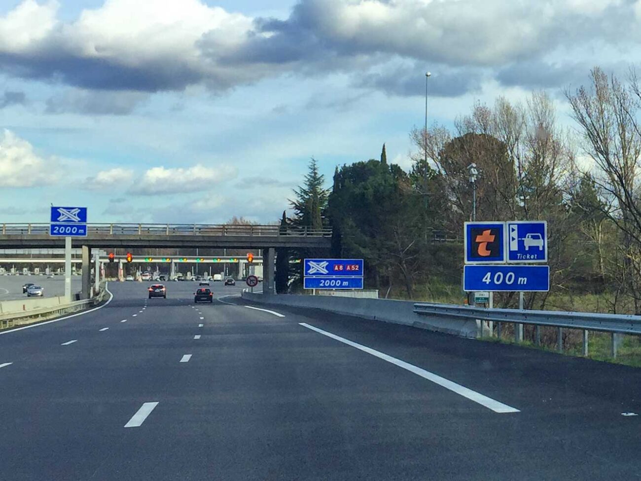 Das „t” steht für „télépéage”. Diese Spuren sind ausschließlich für Fahrzeuge mit Mautbox reserviert. Wenn daneben auch ein grüner Pfeil zu sehen ist, kann man die Spur auch ohne Mautbox nutzen.