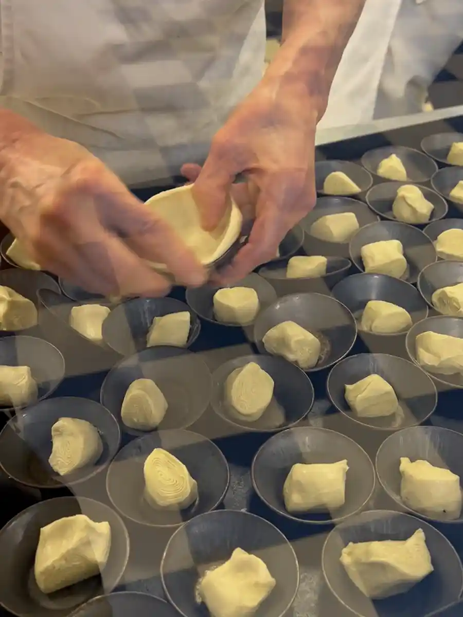Diese Teigfladen werden zu runden “Stangen” von etwa 3 cm gerollt und in kleine Stückchen geschnitten. Jedes Stückchen Teig wird dann mit den Daumen in halb zylindrische Backförmchen gedrückt, die den Boden der Pastel de Nata bilden.