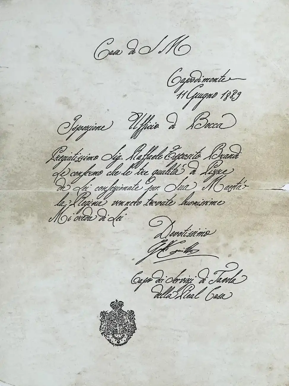 Sehr geehrter Herr Raffaele Esposito Brandi. Ich bestätige Ihnen, dass die drei von Ihnen für Ihre Majestät die Königin zubereiteten Pizzasorten als ausgezeichnet befunden wurden.