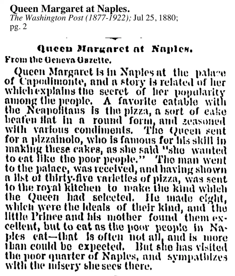 Ein Artikel aus der Geneva Gazette (nachgedruckt in der Washington Post am 25. Juli 1880) berichtet von Königin Margheritas Besuch in Neapel, neun Jahre vor dem berühmten Dankesbrief. Sie erlangte damals Popularität, weil sie Pizza aß, beschrieben als “eine Art flach geschlagener Kuchen in runder Form, gewürzt mit verschiedenen Zutaten.”